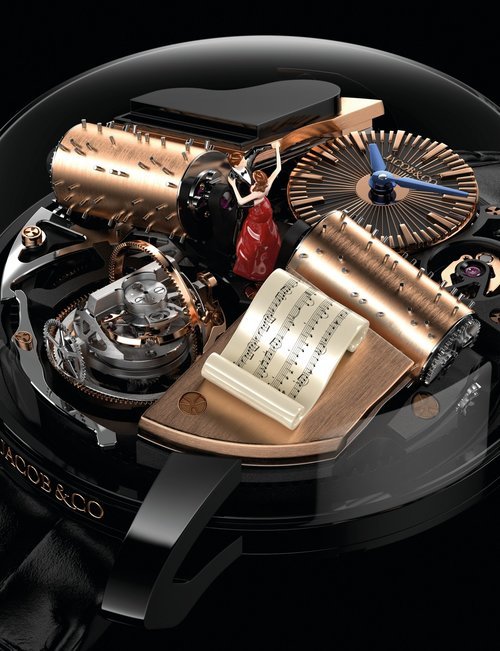 Mechanical hand-wound, Jacob & Co. JCAM19 in-house calibre, rotating 360° in 10 minutes, aventurine base rotating counter-clockwise 360° in 10 minutes, 447 components, 43 jewels, 28,800 vib/h, 48-hour power reserve.