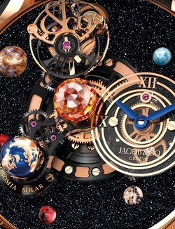 Jacob & Co. sets a new milestone in its representation of the Earth within the solar system with this first-ever reproduction of all eight planets on a dial around a majestic Sun, formed by a citrine displaying the 288 facets of the Jacob Cut®. The hand-engraved Earth rotates around its axis once every 60 seconds and makes one complete revolution of the dial in 10 minutes, as do the flying tourbillon and the hours and minutes dial, all three forming an assembly. Specially created for the Astronomia Solar, the hand-wound JCAM19 calibre is faster than any of the previous movements in the Astronomia collection, despite its smaller size and new functions. By rotating 360° clockwise in 10 minutes, while the aventurine base turns counter-clockwise at the same speed, it creates a captivating, accelerated view of our solar system and an impression of zero gravity.