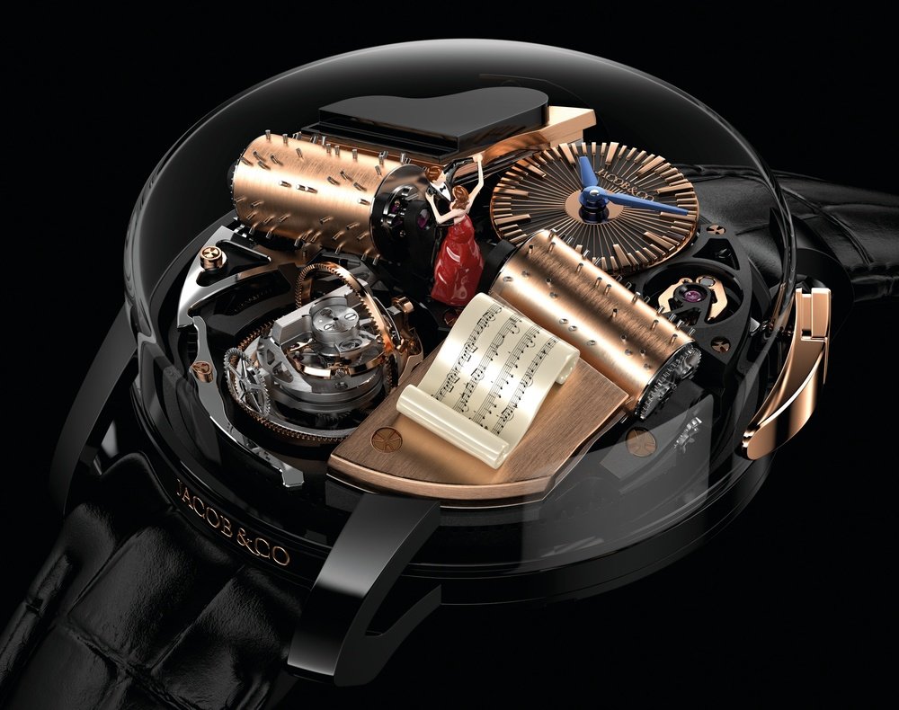 Mechanical hand-wound, exclusive Jacob & Co. JCFM02 calibre, 646 components, 52 jewels, 21,600 vib/h, 120° rotation in 20 seconds, tri-axial tourbillon (rotating in 40 seconds, 3 and 8 minutes respectively), two cylinders in contact with two combs, each with 15 blades, miniature dancing couple in the centre, 72-hour power reserve.
