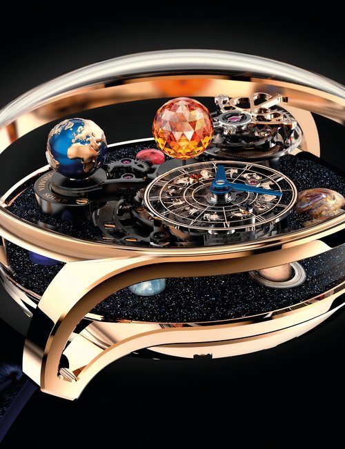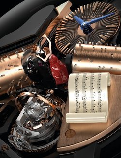For the first time, Jacob & Co. brings together two characteristically Swiss traditions: the mechanical musical box and the wristwatch movement. This 18-piece limited series has been brought to life by mounting two musical-box cylinders and combs on the specially developed, hand-wound JCFM02 calibre, which incorporates titanium components for ideal sound propagation. When the pusher at 2 o’clock is pressed down, a 20-second melody is chimed on 120 notes. As well as being a delight for the ears, this is also a feast for the eyes as the cylinders and blades rotate 120° around the dial as they play. At the same time, the tri-axial tourbillon completes its revolutions. So that 12 is always in the proper position on the off-centre hours and minutes dial, it also rotates counter-clockwise, driven by a patented differential gear.