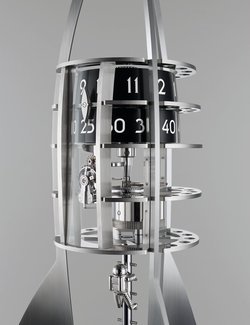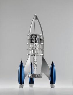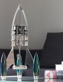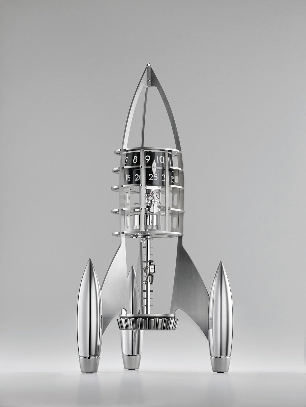 MB&F and L’Epée 1839 remind us how 1960s sci-fi saw the future, with a rocket-clock that comes with an 8-day power reserve and just enough empty space for our imagination to fill. Introducing Destination Moon. Conceived by MB&F and built by L’Epée 1839, it shows hours and minutes on two discs. The movement borrows the vertical structure of a real-life spaceship, with an oversized winding crown in the base. Precision is controlled by a regulator below the time display, protected by near-invisible mineral glass. In a tip of the hat to kids’ toys, the horizontal circular plates are perforated, like pieces of Meccano. Magnetically attached to the ladder that connects the power-thrusting crown to the movement is Neil the astronaut, on his way to space and all its wonders. Each of the four executions – black, green or blue PVD or palladium (silver) – is proposed as a 50-piece limited series.