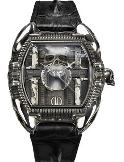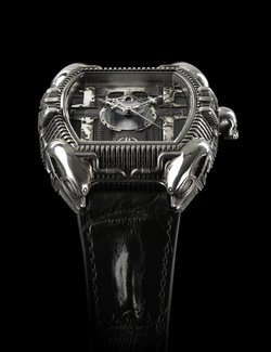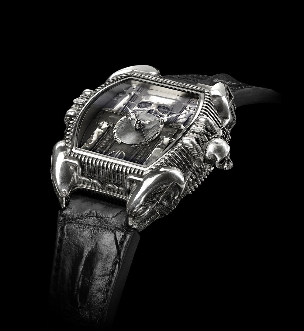 Daniel Strom presents In Memoriam HR Giger watch, one of the final projects on which the Swiss artist HR Giger worked before his death in 2014. A veritable “wrist sculpture”, the timepiece features HR Giger’s legendary biomechanoid creature. Acclaimed for his “fantastic-realism” works, HR Giger shot to fame with his creation of the monster in Ridley Scott’s 1979 film, Alien, for which he won an Oscar the following year. Deeply saddened by the death of this man, who had also become his friend, Daniel Strom waited three years before presenting the watch that they had created together. This exceptional creation, produced in 99 pieces is hand-worked in the silver case, the elongated skulls of the biomecanoid creature extend from the lugs, while its body parts are etched into the case middle. The entirely hand-worked, in silver casted dial was inspired by another of HR Giger’s works, and one of his best-known: the “ELP II” canvas painted with an airbrush in a single night. This creation is the sixth opus of Daniel Strom’s Agonium collection.