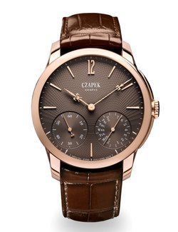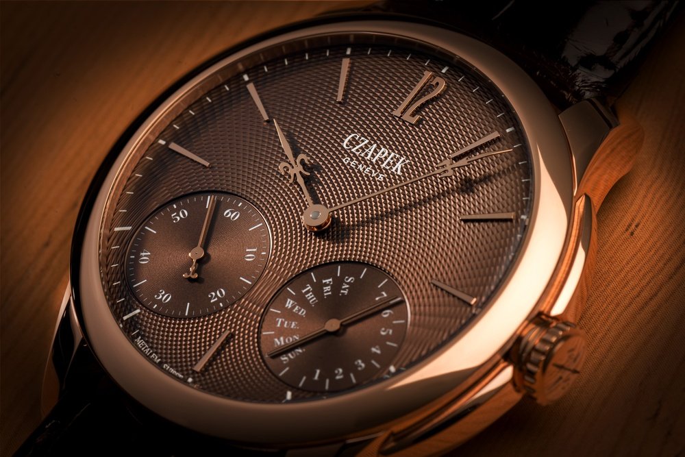 Havana brown handmade domed “Guilloché” dial with exclusive Czapek “Ricochet” design. Small seconds between 7 and 8 o'clock, power-reserve indicator and day of the week between 4 and 5 o'clock