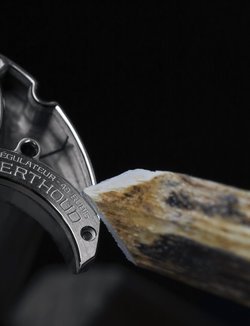 Carburised stainless steel, reinforced by a thermo-chemical process involving the diffusion of vapour-phase carbon, for a surface hardness of 1200 Vickers. Carburised stainless steel screw-down caseback with glare-proofed sapphire crystal and two lateral portholes to view the chain-and-fusee mechanism. Diameter 44 mm, thickness 13.95 mm. Water-resistant to 30 metres (3 bar/100ft)