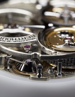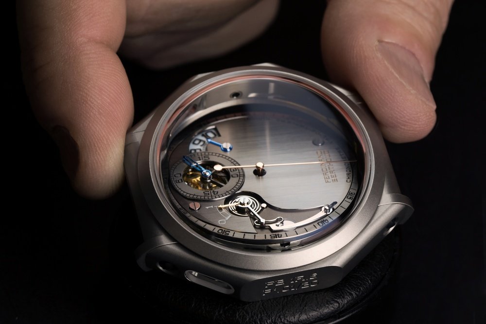 The latest Chronométrie Ferdinand Berthoud watch is inspired by marine chronometers, for which the 18th-century watchmaker is famous. Driven by a fusee-and-chain mechanism, this regulator features an original display of each function, split over the dial. Hours are displayed in an arched window at 2 o’clock, and minutes are shown in a subdial at 12 o’clock. A complicated power reserve display dominates an opening in the space between 8 o’clock and 10 o’clock on the dial. The seconds are directly linked to the 60-second tourbillon, which is featured on the caseback side, along with the mobile-cone power reserve system. The dial is nickel silver that is given a vertical satin-brushed finish and then black rhodium-plated. It is a 20-piece limited edition.