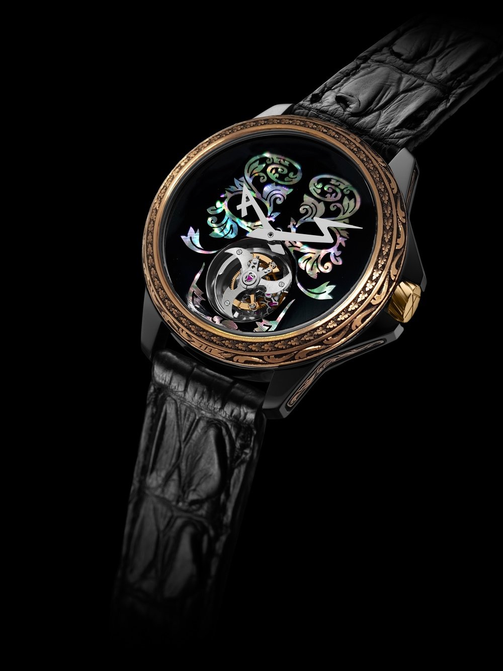 ArtyA is proud to present an exceptional masterpiece entirely hand made from the case (designed by Yvan Arpa and engraved by Bram Ramon) to the dial, (hand crafted in mother-of-pearl in the purest Ott-Chill’s thousand-year-old tradition) and the movement, ArtyA’s own manufacture tourbillon. This exceptional work of art is a real tribute to the highest combined savoir-faire of “métiers d’art” and refined complicated movement. The result is a totally outstanding, fascinating and never seen before Artwork. One more surprise from ArtyA where creativity, avant-garde concept, and innovation is set at a level never reached before. This one-of-a-kind creation is powered by a mechanical movement exclusive to ArtyA, while revealing the fascinating rotations of its flying tourbillon at 6 o’clock.