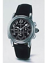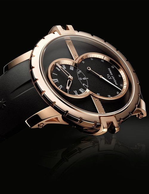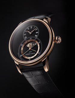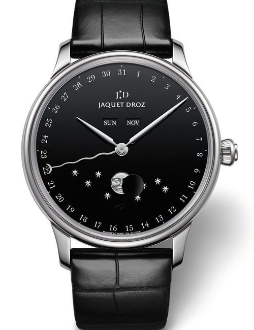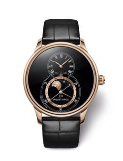 Jaquet Droz’s flagship Grande Seconde collection contains the most poetic of complications, the moon phase, as a tribute to the role of astral phenomena in the origins of watchmaking. The clean aesthetic of the Grande Seconde collection, with its figure-8 dial configuration, is rendered here in black Grand Feu enamel. The lower subsidiary dial is dominated by a realistic moon, engraved out of 22K gold and mounted on a black onyx disk that rotates. It is an astronomical moonphase, which means it requires correction only once every 122 years, and is driven by an in-house automatic calibre with a silicon balance spring. A red-tipped hand indicates the date on an 18K gold ring surrounding the moon phase, while another hand indicates seconds. The moon phase can be set using the corrector at 8 o’clock. The 43 mm case is 18k red gold.