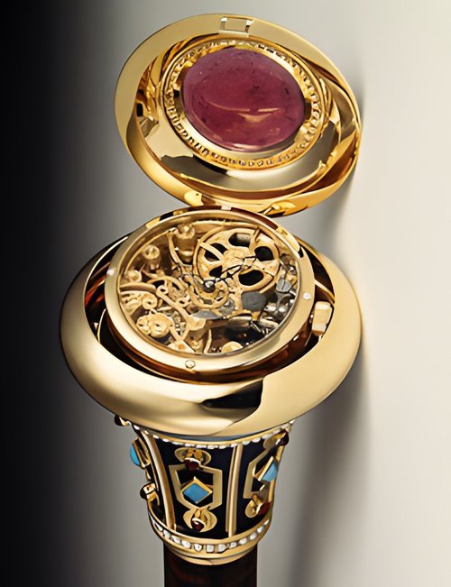 Double-level black Grand Feu enamel with 18k red gold hands, hours, minutes, seconds, star applique and date ring. Date with red varnished top. Black onyx moon disk, moon applique in 22k red gold