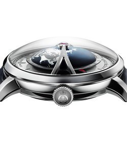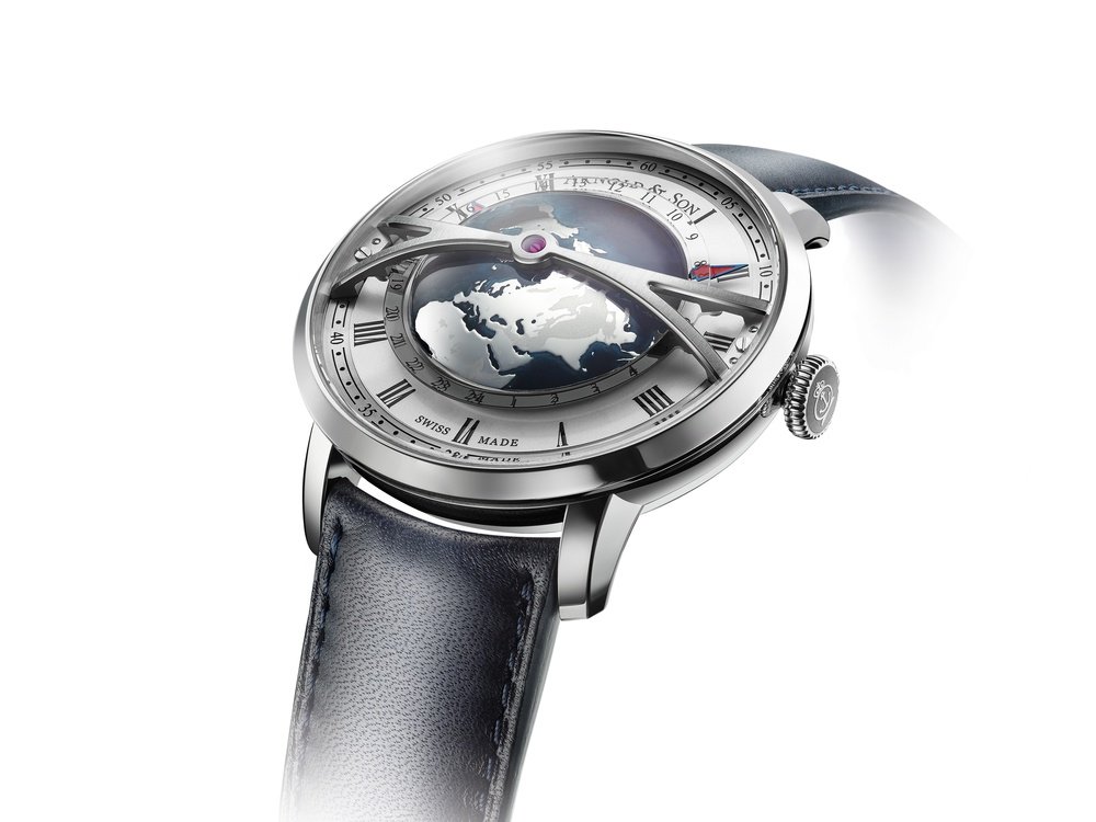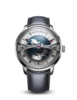 The Globetrotter reimagines the world-time complication as a modern-day navigational instrument. Just as Arnold & Son’s marine chronometers accompanied early explorers on their journeys – including James Cook to the Pacific Ocean and Sir John Franklin to the icy waters of Northern Canada – the Globetrotter world timer is designed for today’s globetrotting adventurers. Part of the Arnold & Son Instrument collection, the central focus of the watch is a large arched bridge that spans and supports a three-dimensional domed dial. This world time dome depicts the Earth’s continents and oceans from the North Pole and is made of brass, textured by chemical etching with a mask, followed by polishing and lacquering. The globe rotates, along with a transparent 24-hour ring that lines up with the red hour hand to indicate the second time zone.