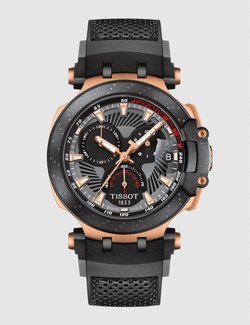 The T-Race MotoGP is a bold, masculine watch that expresses the strength and power of the world of Grand Prix motorcycle racing. The case structure, inspired by the frame of a racing motorbike, is made of black and rose gold PVD, and has a protective fibreglass ring. The dial is inspired by the dashboard, surrounded by a tire tread motif, and the pushers repeat the start/go wording on the control panels of racing bikes. The bezel resembles a brake disc, and the small holes in the rubber bracelet mimic the material of racers’ suits. The black case with red details on the dial reflect the logo colours of MotoGP, and the official logo is silk-printed on the glass caseback. This is a numbered limited edition of 8,888 pieces, each of which comes in a presentation box shaped like a motorbike helmet. It’s time for a powerful start!