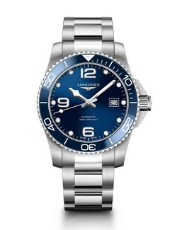 Building on its expertise in the world of sports, Longines is expanding its HydroConquest collection this year, offering reimagined variations. Combining technical excellence and traditional elegance, these watches feature a bezel enhanced with a coloured ceramic insert adding a touch of brilliance and modern styling. This ceramic insert also adds pizzazz to the watch, since it is matched to the dial and strap – either black, grey or blue – reinforcing the vibrant colour. For contrast and readability, the hands and indexes are coated with Super-LumiNova, and the numerals on the bezel are white. This is a true diver’s watch, with 300-metre water resistance, a unidirectional rotating bezel, screw-down crown and case back, crown protector and a double security folding clasp with integrated diving extender. There are two versions, including a 41 mm chronograph model and a 41 mm or 43 mm three-hand with calendar. Each version contains an automatic mechanical movement.