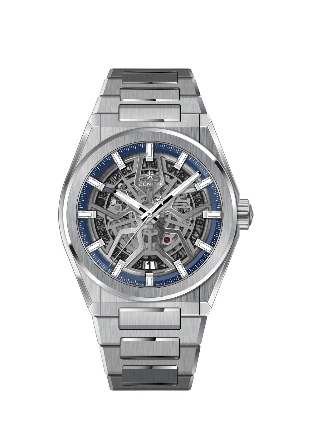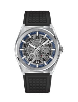 The Defy Classic combines an openworked dial with a sporty, brushed titanium case and an Elite movement. The Defy collection is the embodiment of Zenith’s horological complexity, including the iconic high-frequency Defy El Primero 21 and the Defy Lab, the world’s most accurate mechanical watch thanks to its monocrystalline silicon oscillator. The Defy Classic is a three-hands plus date watch with an openworked version of the automatic Elite 670 base calibre, with its silicon pallet lever and escape wheel. The dial is bordered by a blue minute ring and large applied hour markers coated with Super-LumiNova. The cut-out date disc adds to the high-tech aesthetic exuded by the blackened openworked movement. Strap options include titanium bracelet, black rubber with blue alligator leather coating or black rubber.