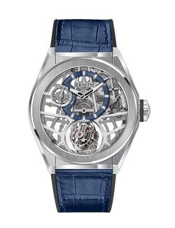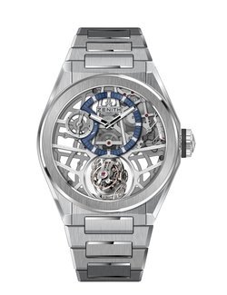 The Defy collection is the embodiment of Zenith’s horological complexity, including the iconic high-frequency Defy El Primero 21 and the Defy Lab, the world’s most accurate mechanical watch thanks to its monocrystalline silicon oscillator. This year, the Defy appears as a full collection, including the Defy Zero G, with gyroscopic “Gravity Control.” The device, fitted here into a skeletonized version of Zenith’s high-frequency El Primero calibre, cancels the effects of gravity by maintaining the regulating organ and balance in a horizontal position. The spherical system is composed of 139 tiny components, which have been redesigned to reduce the module’s dimensions by 70%. This enables it to fit between the two flat sapphire crystals of the Defy case. The 44 mm case is brushed titanium.