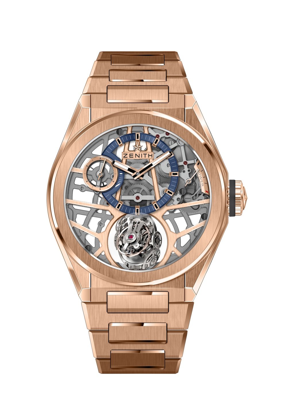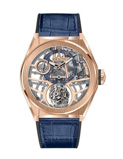 Mechanical hand-wound, Zenith El Primero calibre 8812 S, 324 components, 36,000 vib/h (5Hz), platinum counterweight of the gyroscopic system, 50-hour power reserve