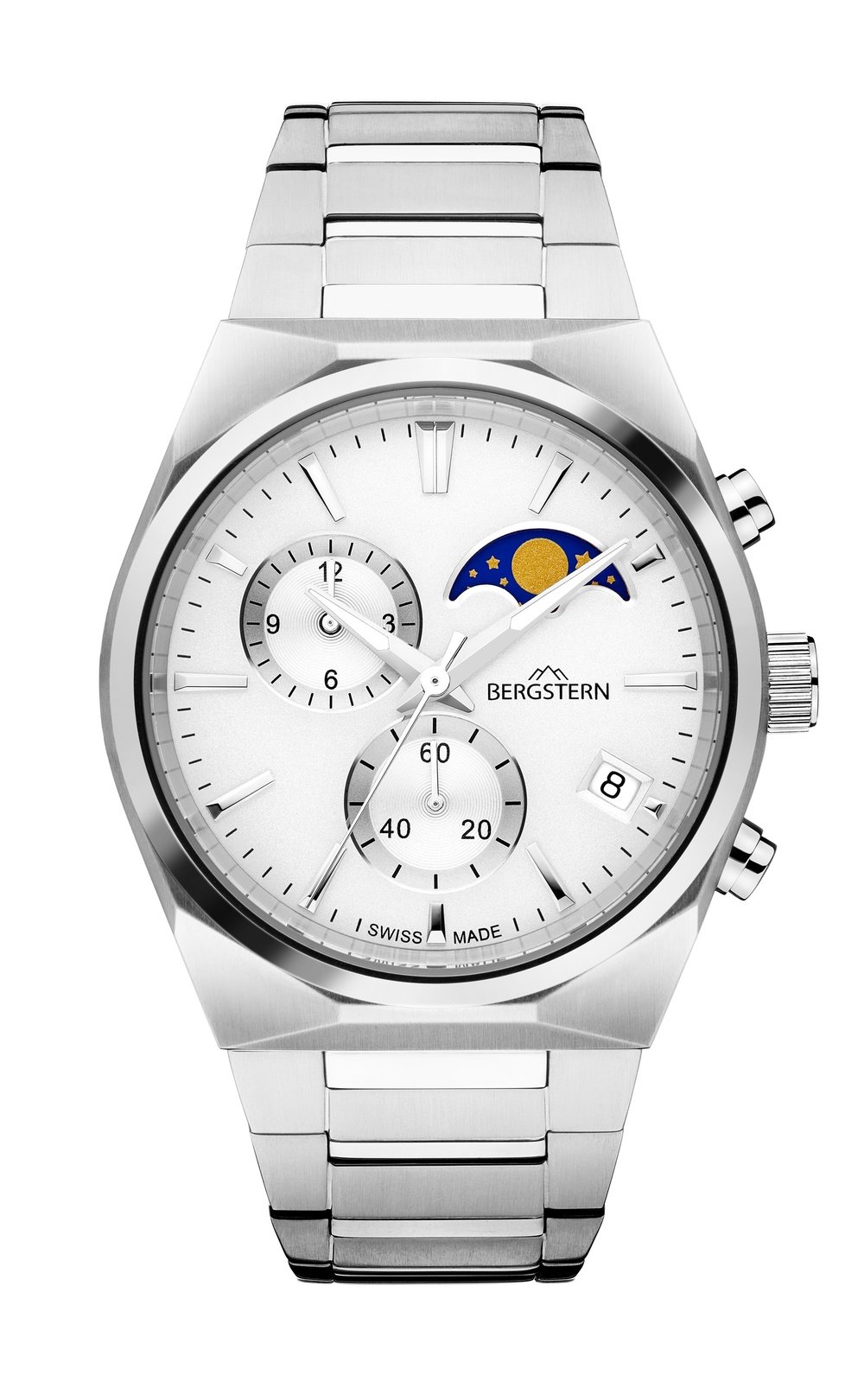 The enduring classic design of the Harmony collection is expressed with a clean, tone-on-tone dial and a clarity of form that recalls the pure alpine skies. While the small seconds dial and chronograph counter are placed at 6 o’clock and between 9 and 11 o’clock on the dial, the moon phase indicator takes a unique position between 1 and 2 o’clock. A discreet date window in the 4 o’clock position balances and “harmonizes” the design. The premium Swiss-made quartz movement has an essential end-of-life (EOL) indicator, a function of great convenience that takes the guess work out of knowing when to replace the battery. The robust 316L stainless steel case is water resistant to 50 metres, making it a suitable companion for sports as well as for more elegant endeavours.