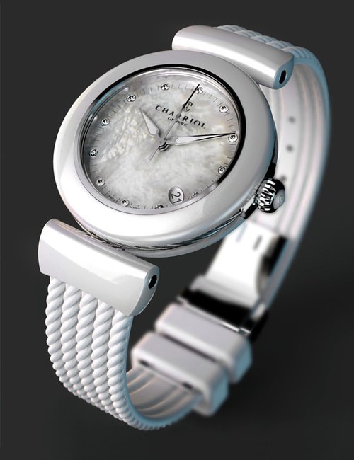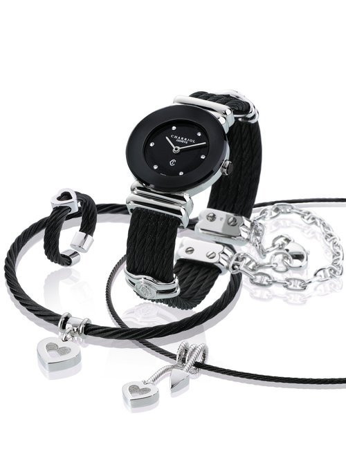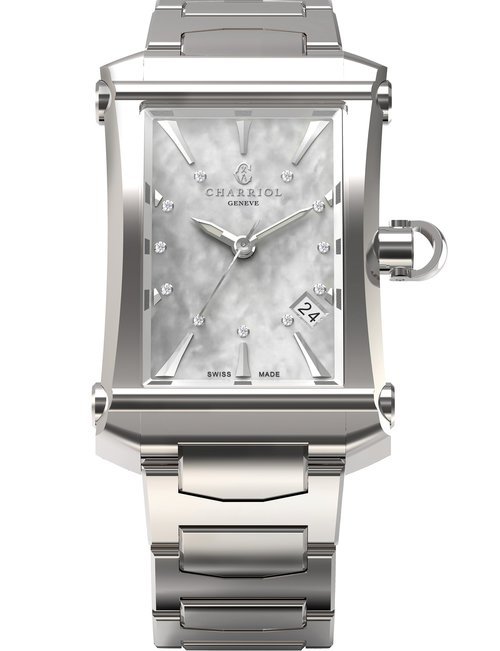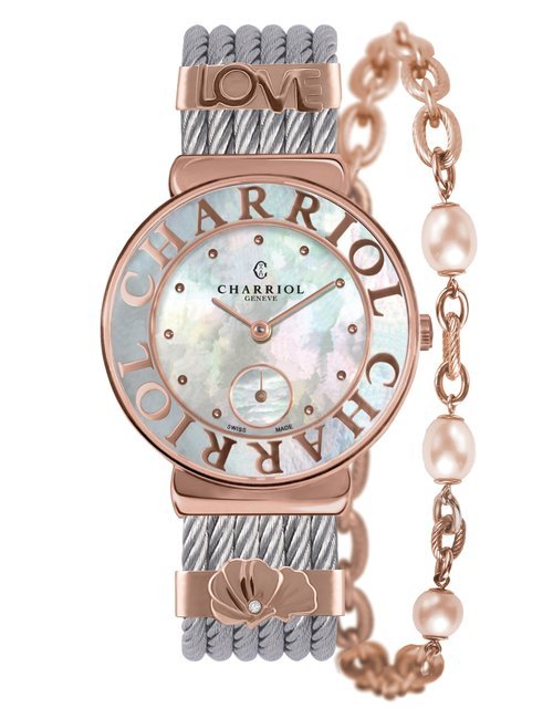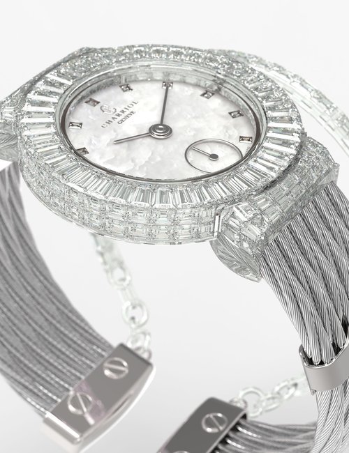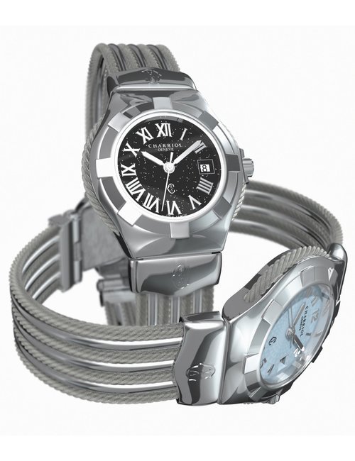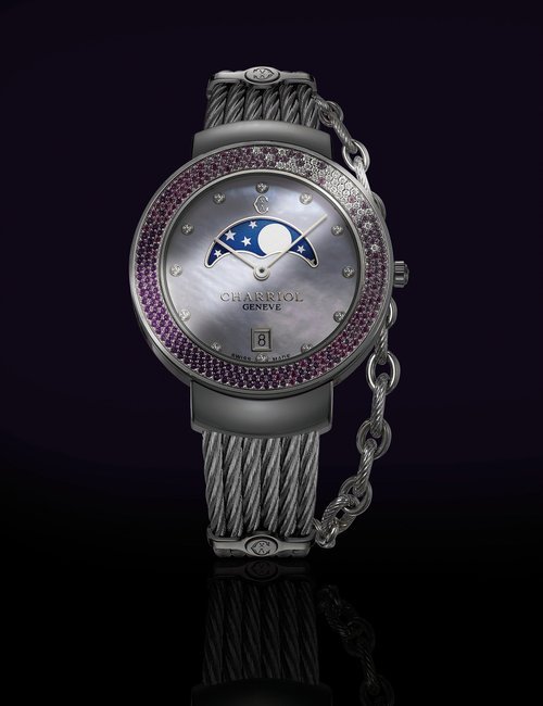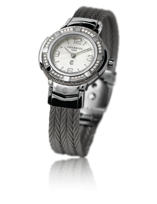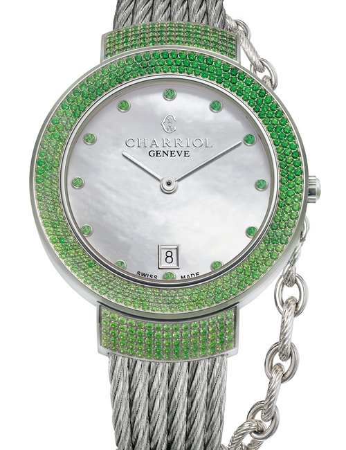 This elegant jewellery watch is inspired by Marie-Olga Charriol, wife of the company founder and an accomplished equestrian rider. Subtle details of the design are inspired by her passion for classical riding, which is linked to watchmaking by the same timeless values: rigor, purity, transmission and passion. The silhouette of the watch reflects the gestures of the rider on her horse, combining voltes and figures, movements performed by the horses. The stirrup-shaped lug at 6 o’clock on the case also emphasizes the equestrian theme. The dial is mother-of-pearl, with a shimmer of watercolor shades, and the case is set with diamonds. Charriol’s signature steel cable is lightweight and ultra-feminine, a symbol of the strength and loving spirituality of women.