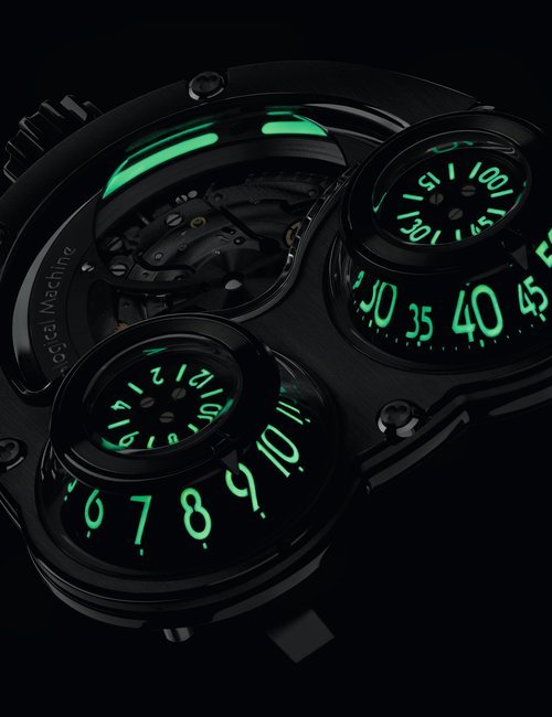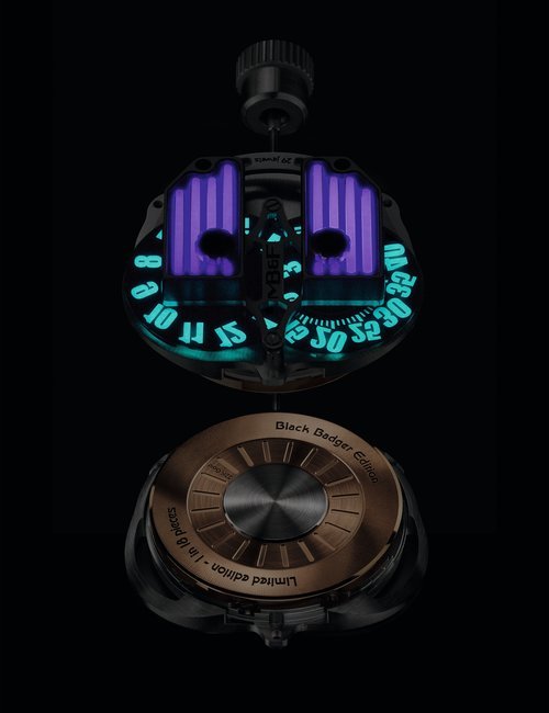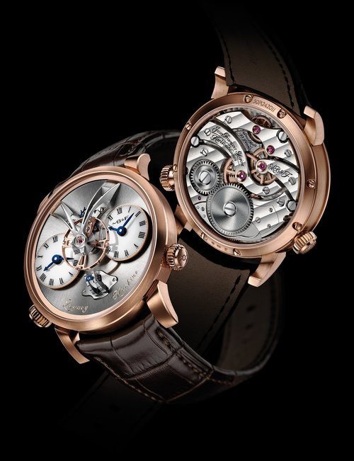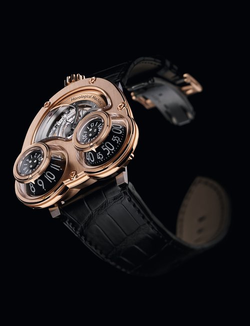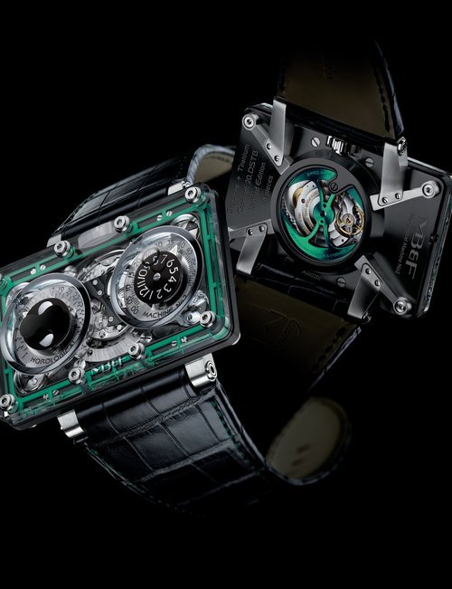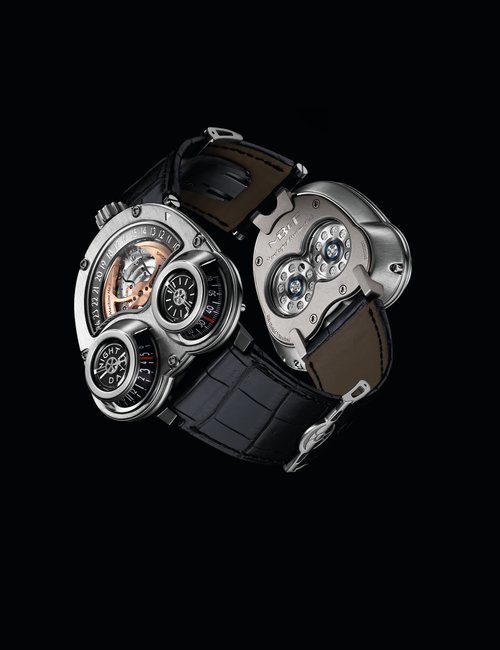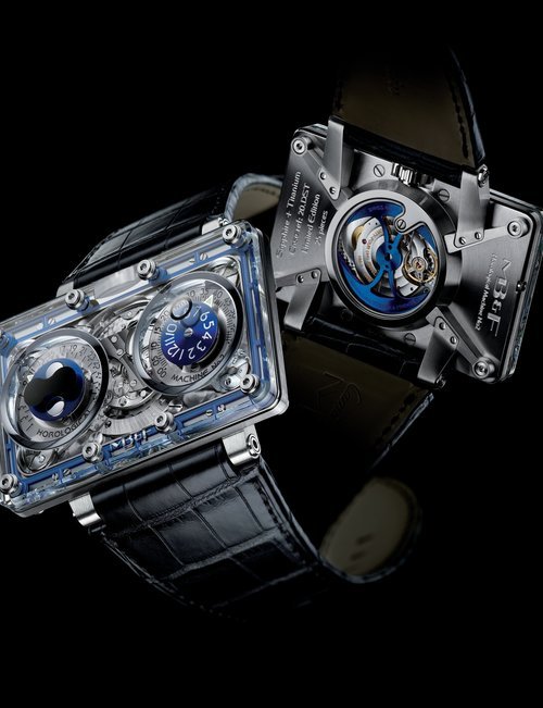 Mechanical automatic MB&F flying 60-second tourbillon, sun-motif rotor made of 18k gold, titanium and platinum, 18,000 vph, 100-hour power reserve.