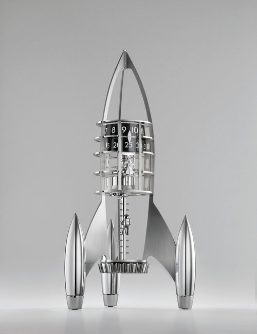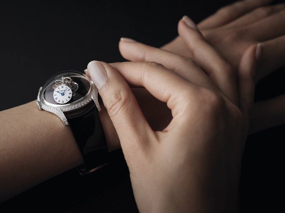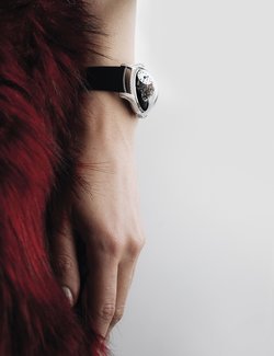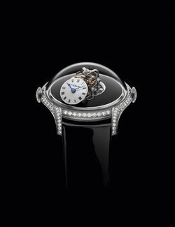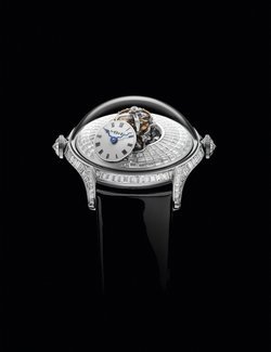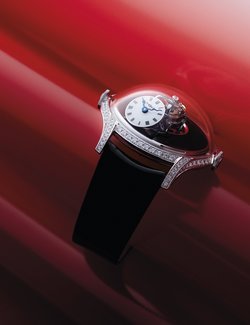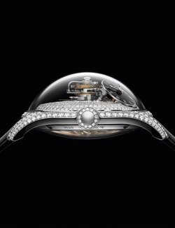 Now in its 14th year of creating collaborative works of audacious horological art for the wrist – and sometimes for the tabletop – MB&F has finally created a timepiece dedicated exclusively to women. The Legacy Machine FlyingT is a three-dimensional creation, with a steeply cambered bezel and slender, beveled lugs on a round case that is fully set with diamonds. The high, convex domed sapphire crystal hovers over a curved dial plate. An asymmetric opening frames a raised flying tourbillon escapement, the carriage of which is topped by a single large diamond. A dial of white or black lacquer with blued gold hands sits on a 50° tilt at the 7 o’clock position. The watch is set with either round-brilliant or baguette diamonds.