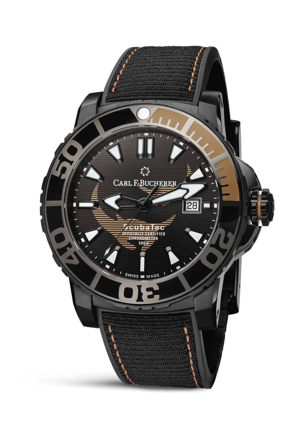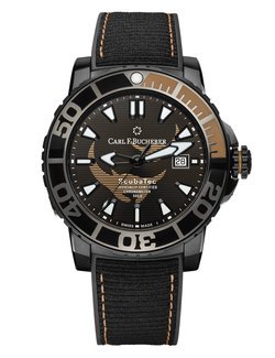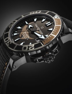 Rubber strap with recycled PET textile layer, diving folding clasp in DLC-coated titanium.