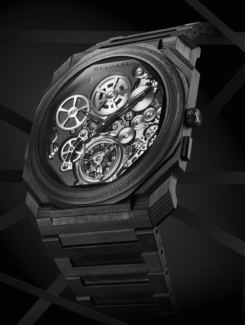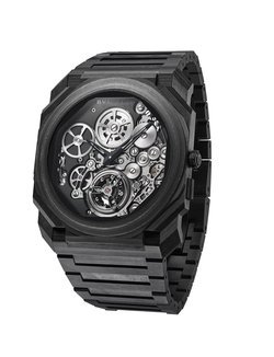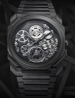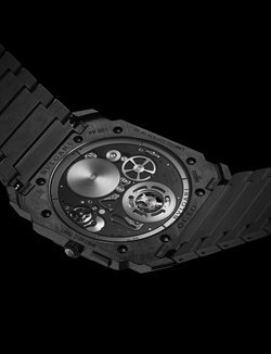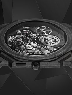 The Octo Finissimo collection has been the venue for BVLGARI’s expression of modern high watchmaking, with innovation designs, complications and world records. The latest interpretation is the Tourbillon Carbon, which combines the world thinnest ultra-thin flying tourbillon with an innovative case material. The case and bracelet are made of carbon CTP (Coal Tar Pitch). The movement, a technical marvel at only 1.95 mm thick, thanks partly to an innovative peripheral rotor. It is showcased in an openworked dial with black finishing, and can also be seen through a transparent caseback. The Octo Finissimo Tourbillon Carbon is the thinnest-ever automatic carbon watch. It is a limited edition of 50 pieces.