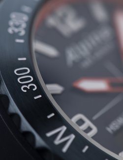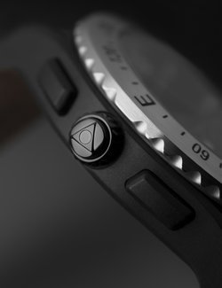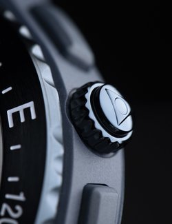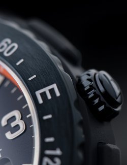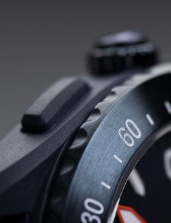Navy blue fibreglass and stainless steel, 45 mm, 360° bi-directional turning compass bezel, convex scratch resistant sapphire crystal, engraved case back. Water resistant to 100 metres (10 bar/330ft).