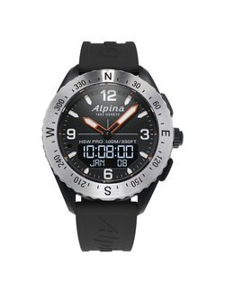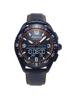 Navy blue with matte finishing and applied white luminous silver indexes, digital screen, orange-coloured matte hands with white luminous treatment.