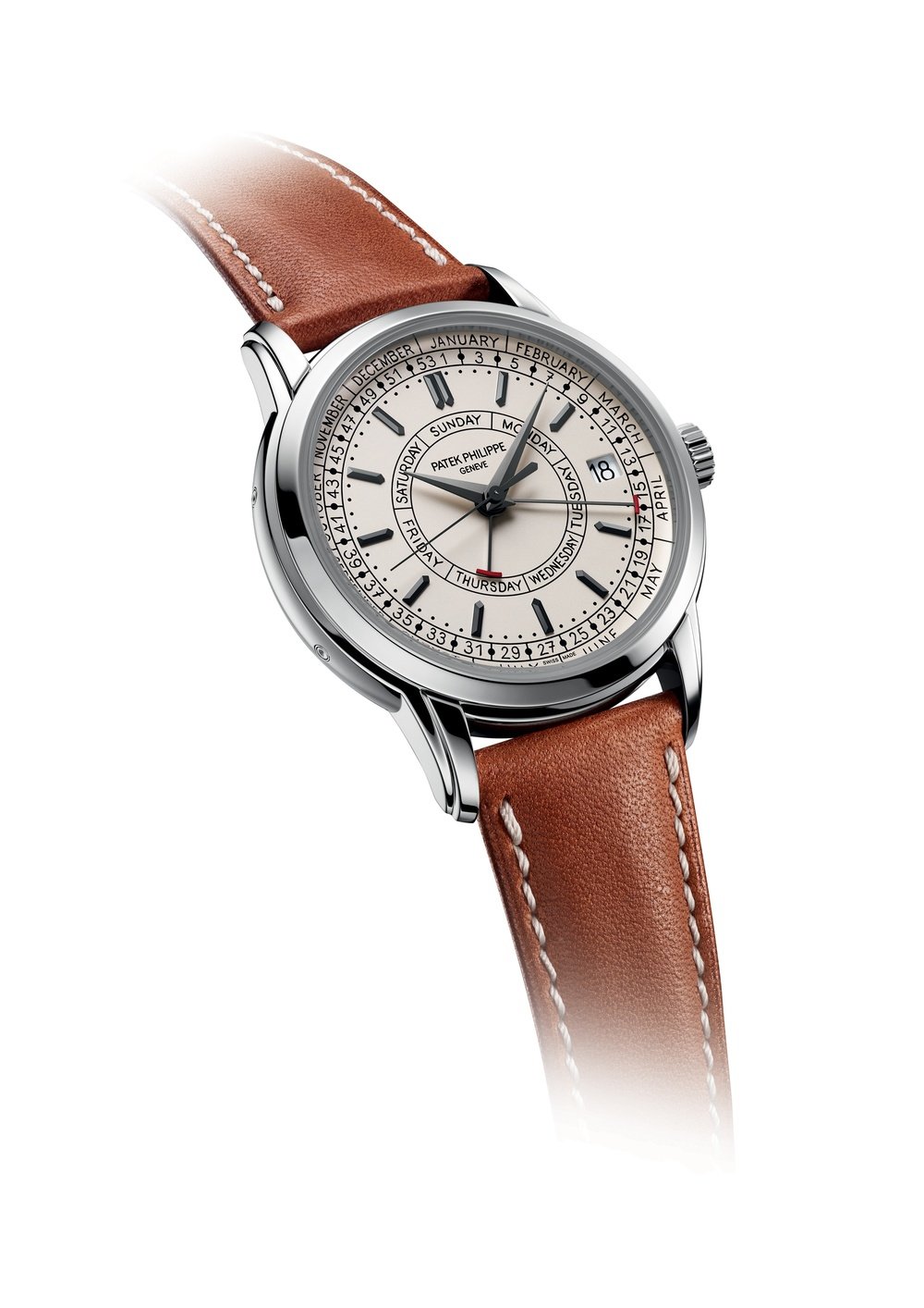 PATEK PHILIPPE introduces a new complication in an automatic movement, calibre 26-330 S C J SE. It is a weekly calendar with a semi-integrated mechanism displaying the current week number, in addition to the day and the date. The silver opaline dial and black markings are contrasted by red-tipped hammer-style hands that indicate the day and week number with corresponding month. The dial font used for day, date, month and week number is meant to reproduce the look of authentic handwriting, endowing the watch with a vintage look. Easy-to-set correctors for days and week numbers are placed at 8 o’clock and 10 o’clock on the 40 mm polished stainless steel case, which has two-tier lugs. The 5212-A is the only steel Calatrava in PATEK PHILIPPE’s current collection.