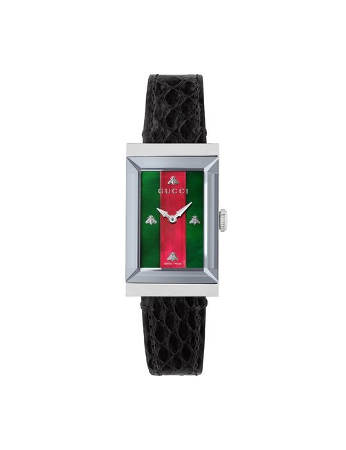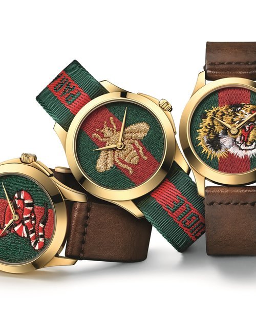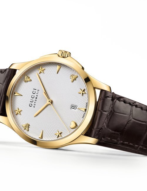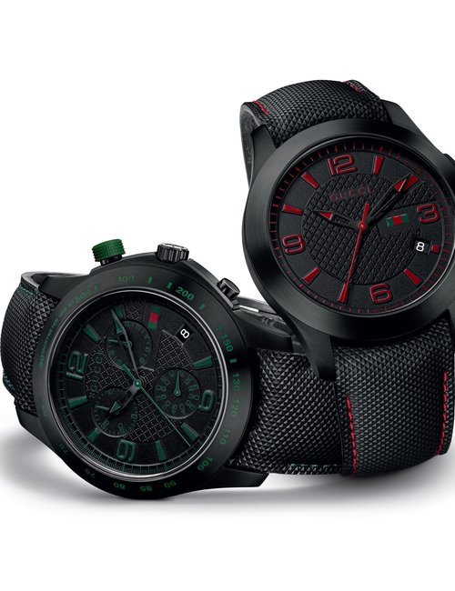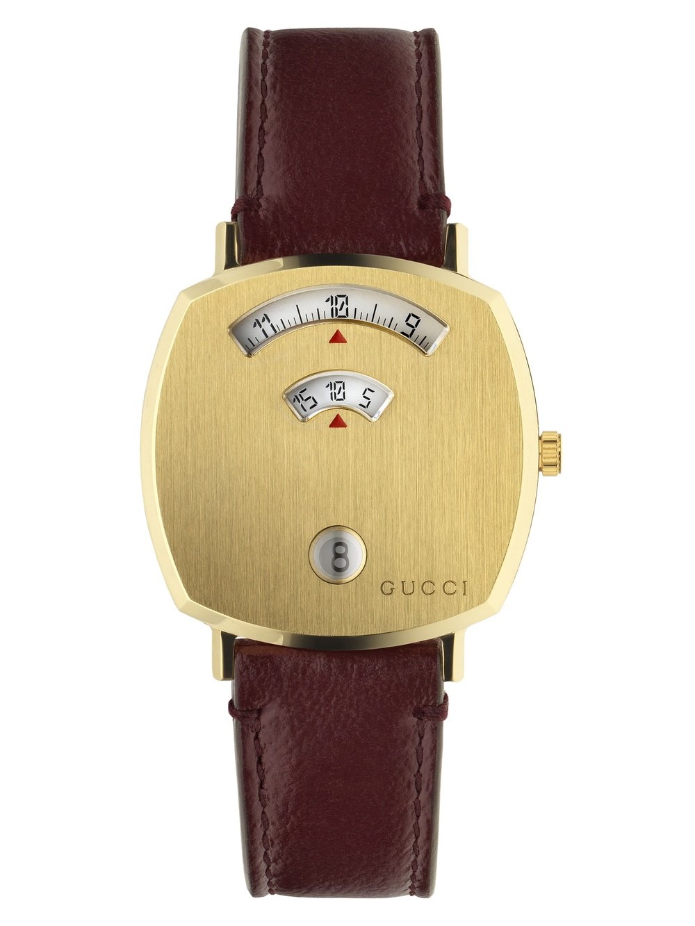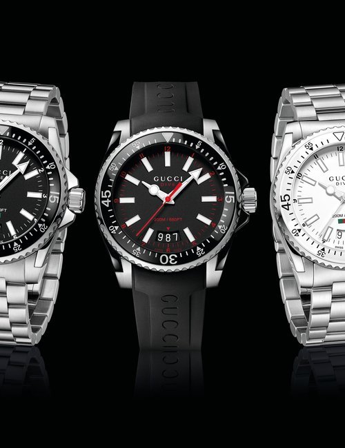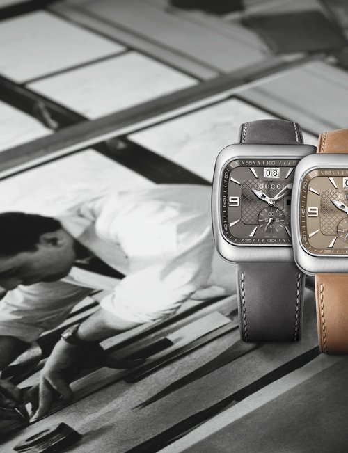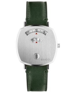 Gucci is introducing a brand-new unisex watch line called Grip. Its unique design blends timeless appeal with highly contemporary style. The collection comprises four new quartz timepieces. Each one features a rounded square case with three windows, in which three white rotating disks indicate the hour, minute, and date respectively. One edition brings together a yellow gold PVD case and yellow gold PVD bracelet, both engraved with Gucci’s signature Interlocking G logo. Another variant is worked purely in steel for a sleek, modern look that combines easily with different outfits. Adding a sophisticated and luxurious touch of color to the line, two further editions are offered with colored calf leather straps: green with a steel case, or bordeaux with a yellow gold PVD case. Grip is the perfect choice for men and women who appreciate clean yet eye-catching design with vintage appeal.