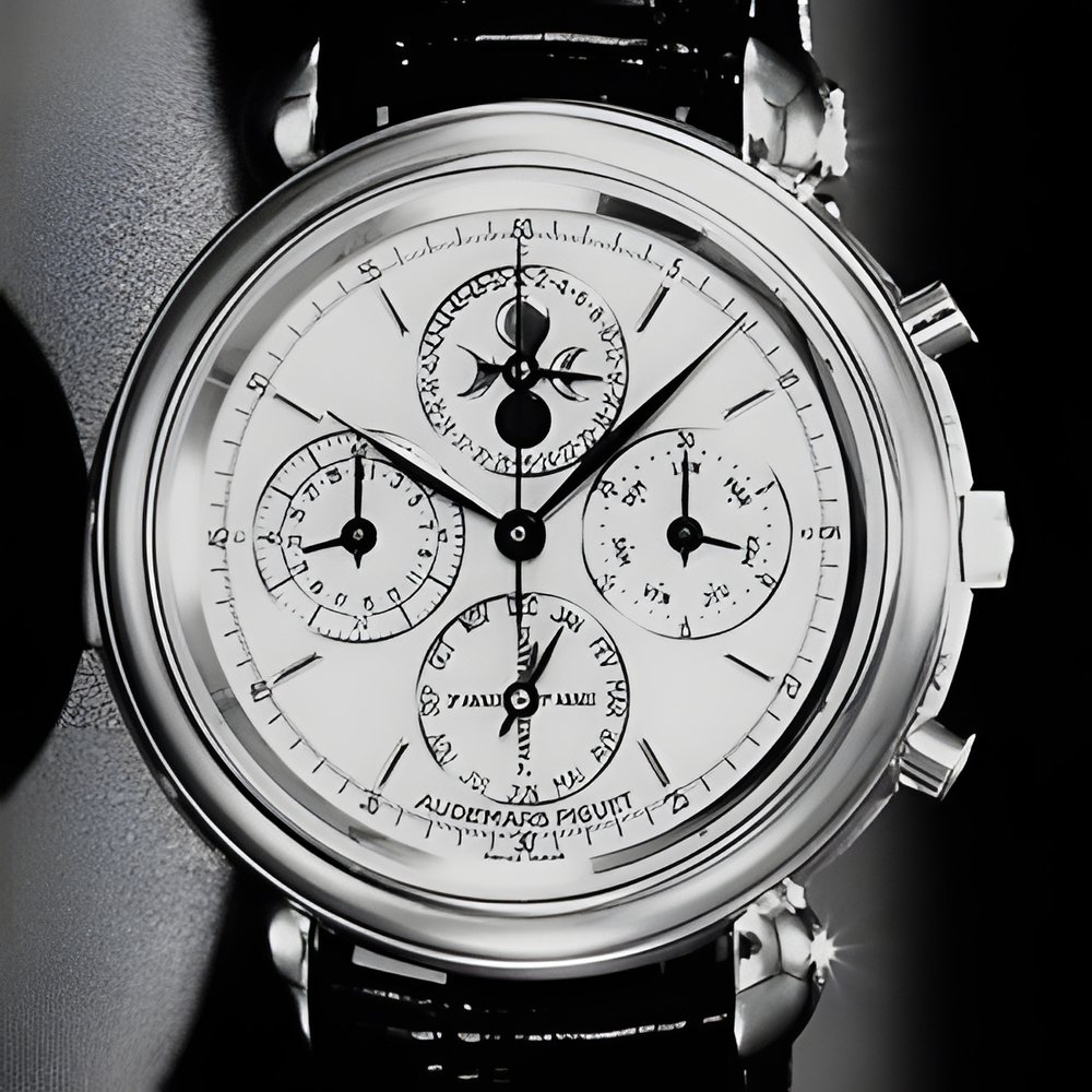 Audemars Piguet presents its “Triple Complication” design, fitted with a seifwinding movement. Perpetual-type calendar providing the date, day, month, 52 weeks, leap years and moon phases. Minute repeater striking on demand the hours, quarters and minutes. Chronograph with 30-minute totalizer. (AuDEMARS PICUET “Triple Complication”)