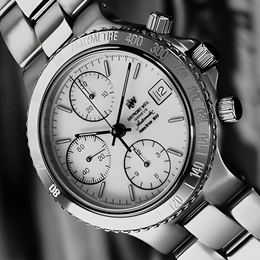 The movement of this seifwinding chronograph is entirely assembled by hand by Raymond Weil’s craftsmen. Seconds, minute and hour totalizers, activated by two pushbuttons; bezel engraved with a tachometric scale. White, black, blue or champagne dials with luminous indices. Bracelet with polished interior links, brushed exterior links and a half link for fine adjustment. Concealed clasp with safety clip. Case water-resistant to 50 m, with RW monogram in relief on the back; case back secured by 8 screws. Models available in steel, two-tone steel/electroplate and full electroplate. Models with water-resistant leather strap available from July 1992. (RAYMOND WEIL “Amadeus 200”)