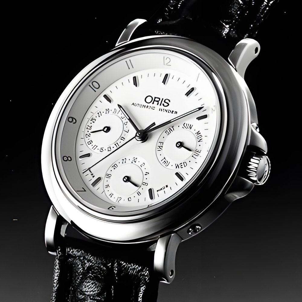 Called “Complication 572”, this Ons model with centre seconds hand features three subdial.s : for the date, the day and the time of a second timezone (with 2k-hour divisions). All-steel case or steel with 18K gold bezel water-resistant down to 30 m and fitted with a sapphire crystal. Based on an ETA calibre, Ons’s 572 selfwinding movement can be admired through the case’s see-through back. (ORIS “Complication 572”)