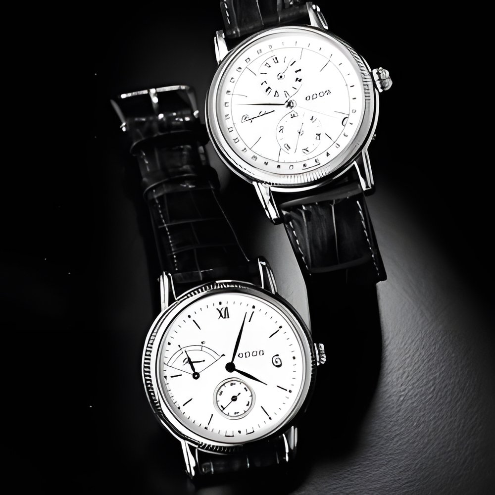 Top : regulator-type wristwatch with centre seconds hand, off-centred hour circle, small seconds hand and pointer-type date calendar. Bottom wristwatch with power-reserve indicator, small seconds hand and date calendar in a dial aperture. Steel cases, fluted bezels, sapphire crystal and case back. Meticulously finished movements, visible through the back bevelled edges, “cote de Genève” finish, blued screws. (EPOS - P.M. Hofer S.A.)