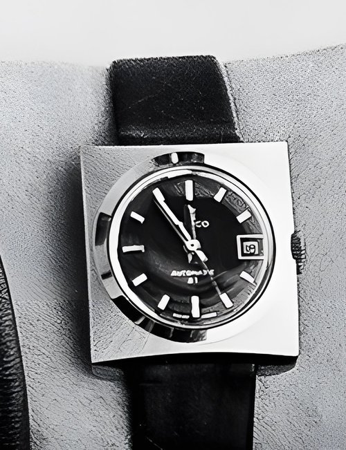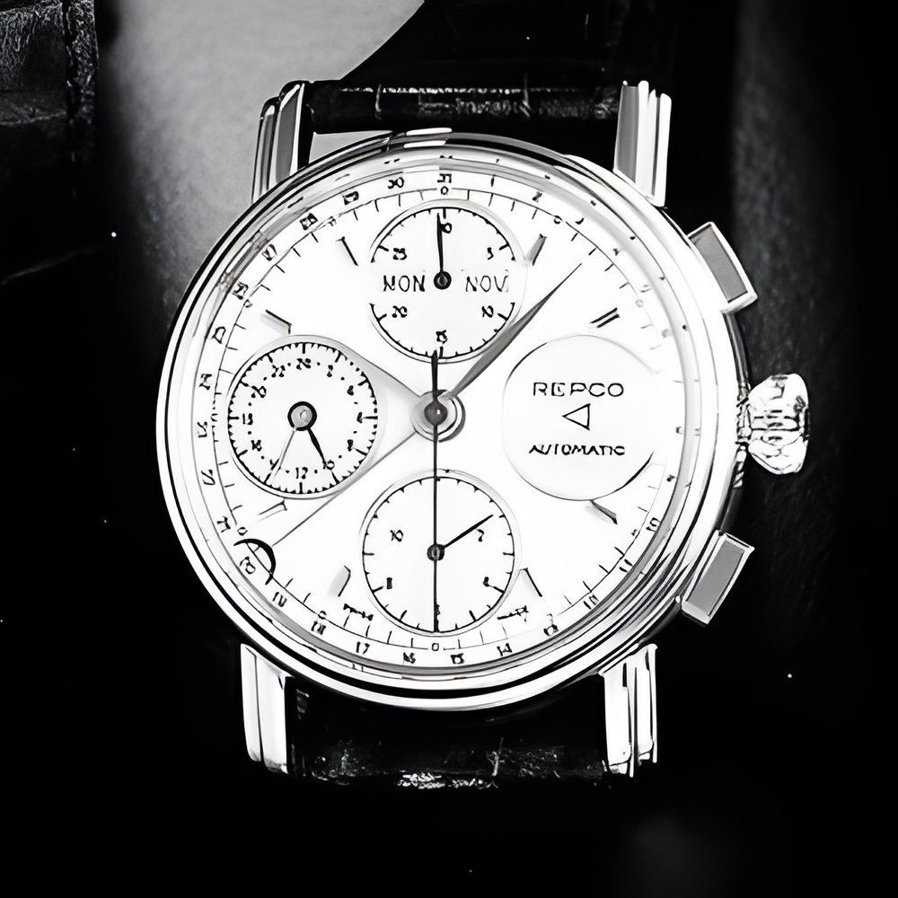 This pair of Repco chronographs equipped with Vaijoux seifwinding movements feature an 18K gold case. Left : with rounded flanks, day and date calendar, hour and minute totalizers and small seconds hand. Right : stepped bezel, day and month aperture calendar, pointer-type date calendar, hour and minute totalizers, small seconds hand and 24-hour time display. Also available with moon-phase indicator. (REPCO WATCH S.A.)
