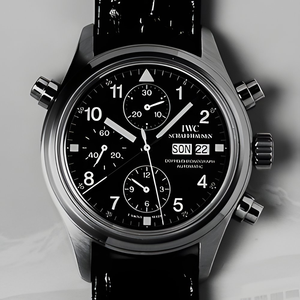 After two years of intensive development, IWC is introducing its selfwinding split-second chronograph dubbed “Doppelchronograph” at BASEL 92 It boasts a double seconds hand : a press on the 10 o’clock pushpiece separates one from the other : the first stops while the second continues to move. A second press releases the first to “fly back” and rejoin the second’s travel. This intricately sophisticated system conveniently provides split times. Its movement stores a 8-hour power reserve, is shielded against magnetic fields and includes a day and date calendar. Its styling is akin to that of the famed “Mark XI” (1948) and “Fliegerchronograph” (1988) : steel case water-resistant to 50 m with screw-locked crown; special outcurved sapphire crystal. (IWC International Watch Co., Schaffhausen “Doppelchronograph”)