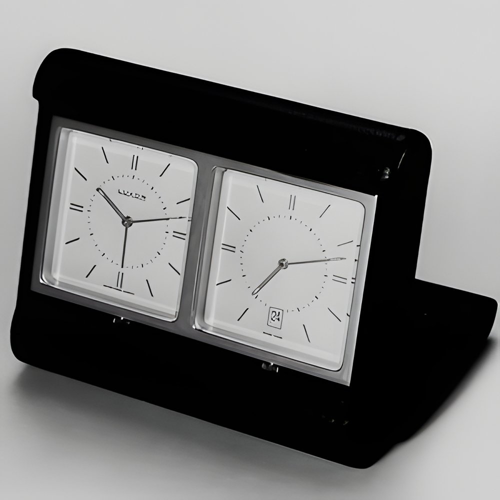 Travel alarm displaying both local time and home time. Leather case (in matching colors) with back prop folding over the dials. To each dial corresponds an individual quartz movement : one with alarm mechanism, the other with calendar. (LUXOR)