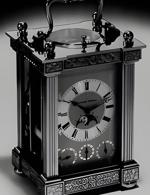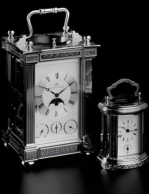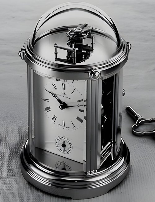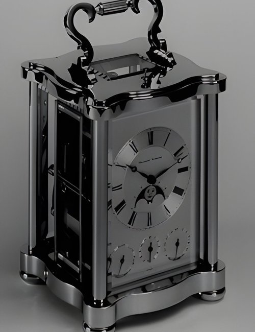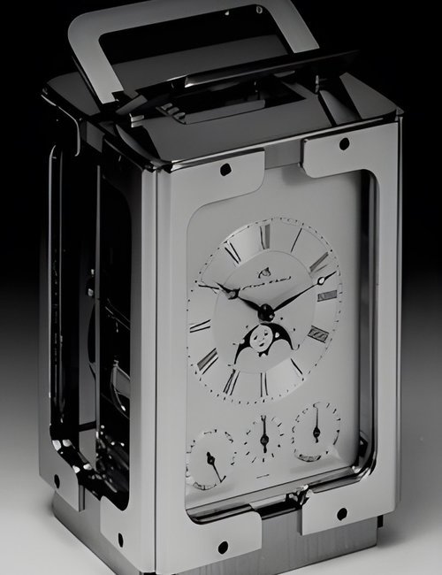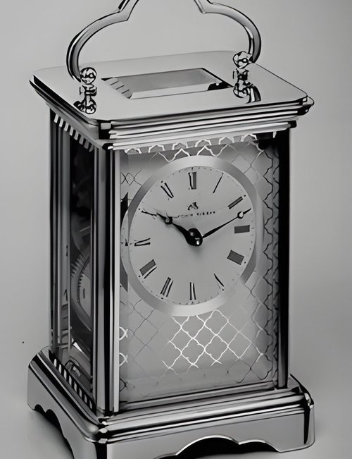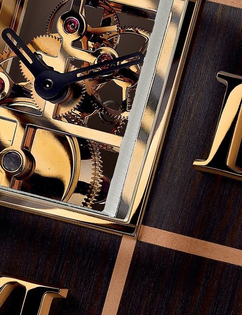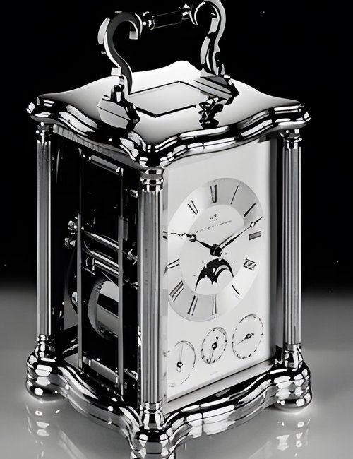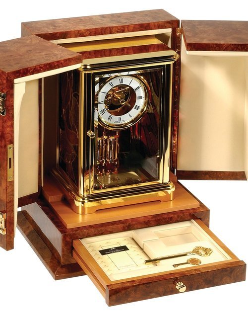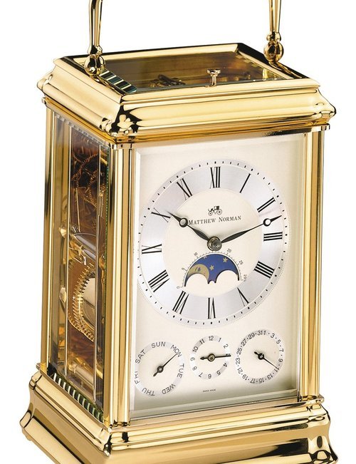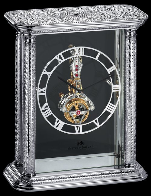 A prestigious, generously proportioned table clock (10 x 6.7 x 6“) is joining Matthew Norman’s”Mercury Pendulum“collection. Its solid brass case features a genuine, Tiffany-style stained glass panel. Its mechanical movement features a mercury (or Graham) pendulum that offsets the effects of temperature variations. (MATTHEW NORMAN”Mercury Pendulum")