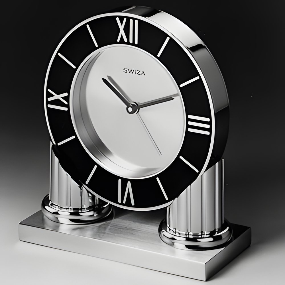 A new, exclusive table clock design now joins Swiza’s “Agora” collection. Its case is made of hand-polished solid brass enhanced with a wine-red lacquered bezel. An entirely gilded and a black-bezel variant are also available. Swiza Swiss Made quartz movement, with alarm device. Dimensions: 14 X 3.6“. (SWIZA”Agora")