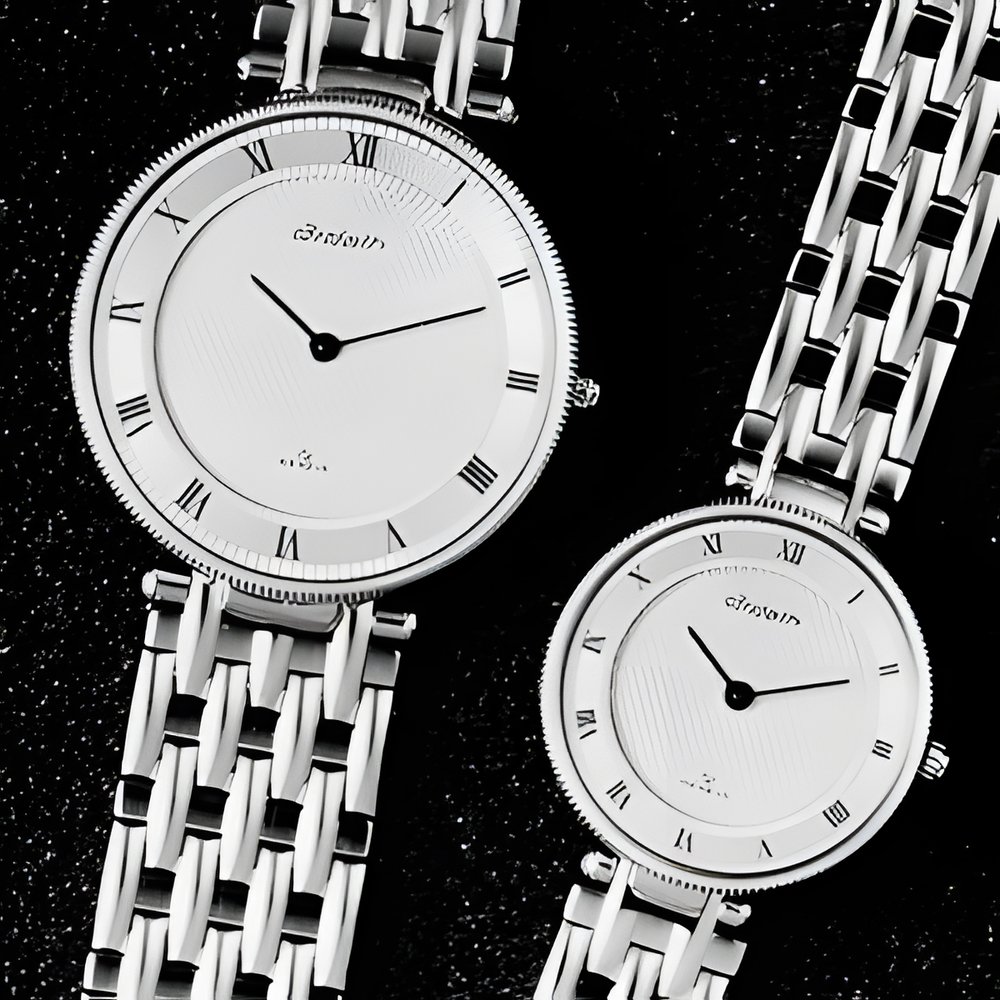 These extra-slim but water-resistant wristwatches feature fluting executed entirely by hand. The dial ring carries twin “jump-track” tone on tone grooving and the dial centre itself is stamped with small lozenge patterns. Cases and bracelets are 10-micron goldplate, with sapphire crystals. (ARDATH “Les Cannelées”)