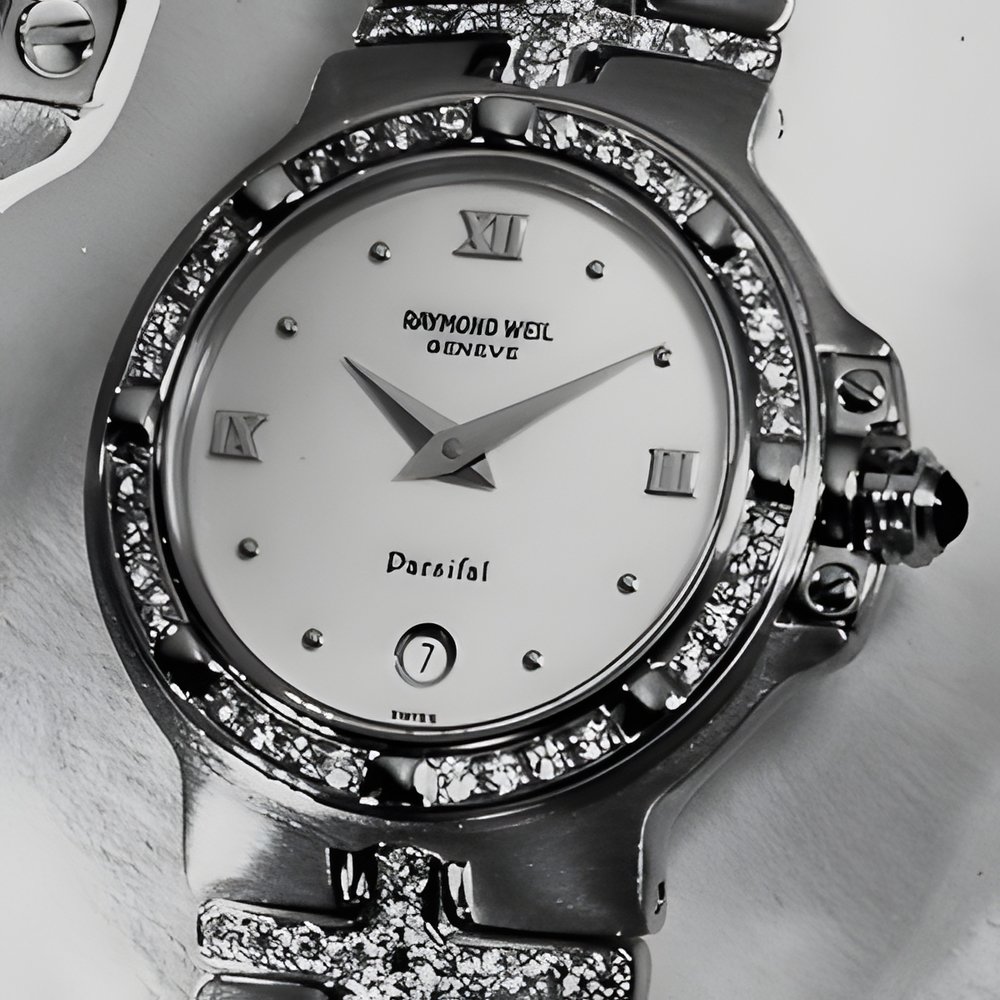 I gold screws secure the back of the case, water-resistant to 30 m. Folding clasp bracelet. Top-quality quartz movement with date calendar. Close-up gold model with Roman numerals on the dial, fitted with a genuine alligator strap. (RAYMOND WEIL)