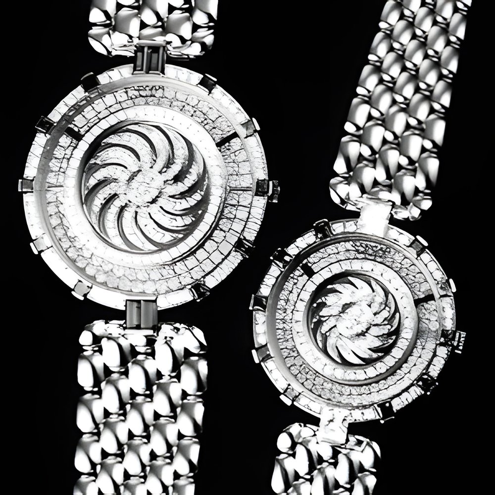 Intriguingly mysterious, this “Magic Moon” watch’s centre mobile, sparkling alluringly at the slightest wrist movement, is sure to attract admiring glances. 18K yellow gold case set with diamonds and rubies. (SARCAR “Magic Moon”)
