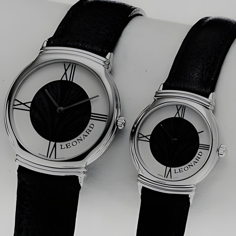 Presented by Leonard, this original design joins the “Scorpio” collection. 10-micron goidpiated case water-resistant to 30 m, fitted with a leather or alligator strap. Choice of classic dial face or fancy, fabric-motif pattern matching the bracelet. Note the original brand-name inscription. Quartz movement. Swiss made. (LEONARD “Scorpio”)