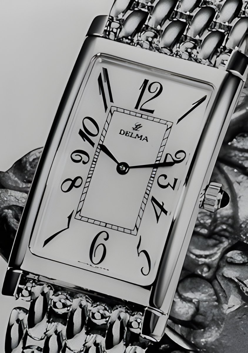 Classic in style and modern in spirit, Delma’s “Nice” model features a rectangular case water-resistant to 30 m, a not inconsiderable technical performance - all the more so that the case is ergonomically curved to hug the wrist snugly. Stone-tipped crown and mineral crystal. Dial with Roman or Breguet numerals, minute track or black face enhanced with a diamond marker at 12 o’clock. Velvety finished metal bracelet or teus lizard strap. International warranty honoured in 90 countries. (DELMA “Nice”)