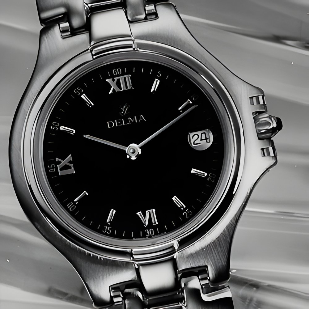 Delma is launching a new design at BASEL 92. Called “Florida”, it now joins the Jubilee collection. This sporty yet stylish creation is carved from a block of stainless steel and features 18K gold decorative trim. Case water-resistant to 30 m, with stone-tipped crown protected by a crown guard. Choice of dial styles, sapphire crystal. Bracelet in 18K gold and steel or tejus lizard strap. International warranty honoured in 90 countries. (DELMA “Florida”)