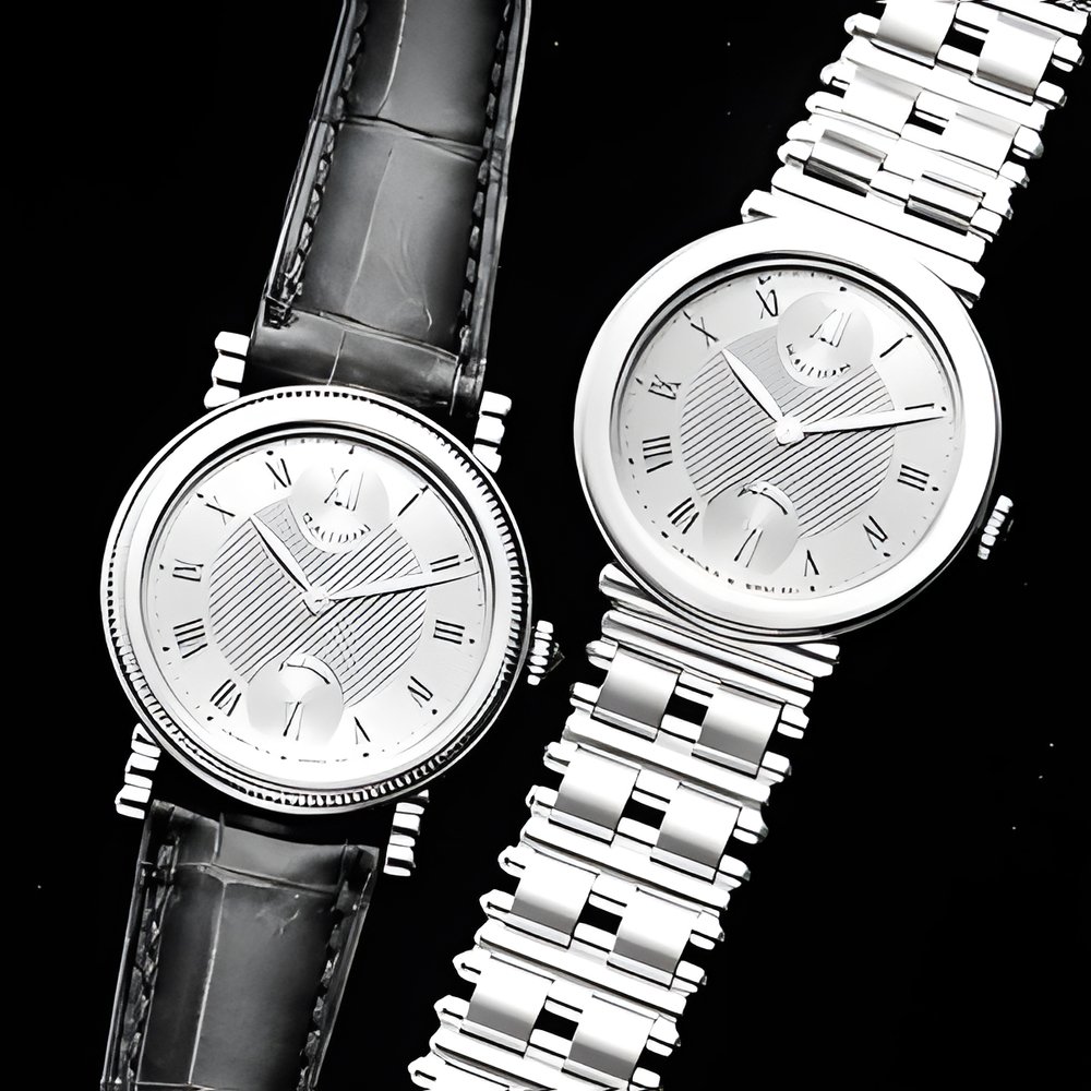 These Waltham designs are fashioned in 950 platinum, dial and strap buckle included, and feature a diamond-tipped setting crown. With alligator strap at left, with platinum bracelet at right. Quartz movements. (WALTHAM)