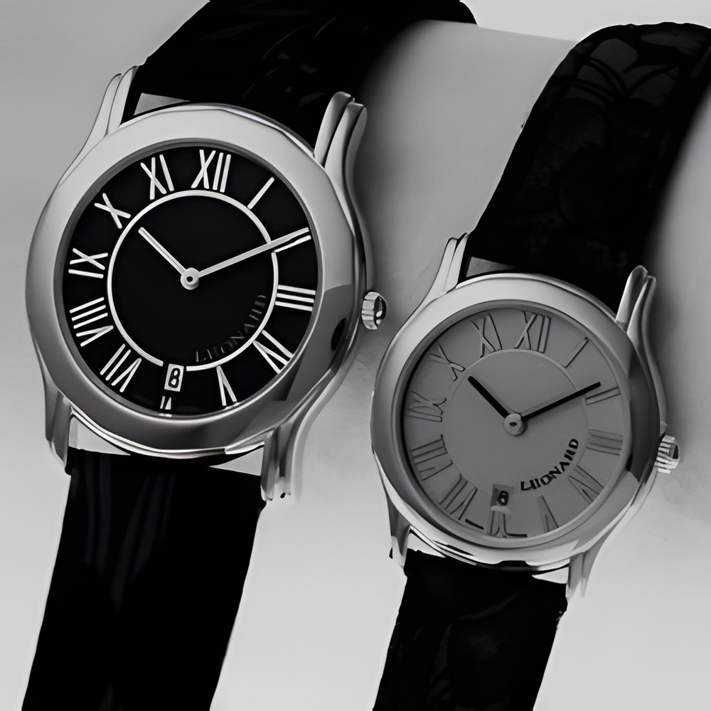 Léonard presents these two “Scorpio” models in 10-micron goidpiate. All metal surfaces are polished and its 16 facets add eye-catching lustre to the bezel. Dials feature either Roman numerals or raised markers and display a semi-circular signature. Cases are water-resistant to 30 m and hold ETA Swiss Quartz movements. Silk straps. (LEONARD “Scorpio”)