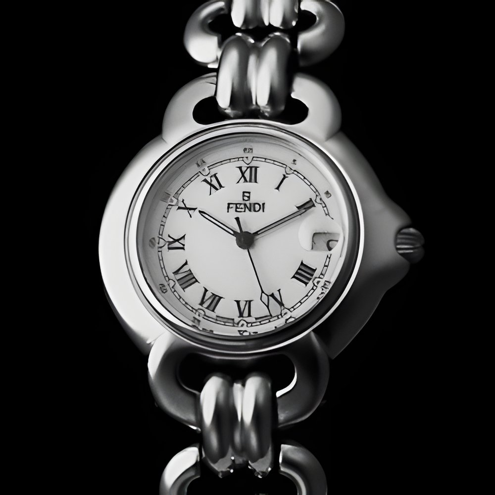 This new Fendi model features a round flanked case water-resistant to 50 m and a sapphire crystal with magnifying lens at 3 o’clock. Available in both women’s and men’s versions. Original case-linkage system of its deploymentbuckle strap. In steel, steel and gold or 18K gold. Black, white or champagne dial, with painted or applied Roman numerals. (FENDI - Ultima Brands S.A.)