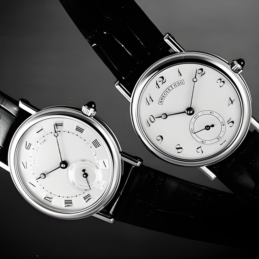 Breguet presents new handwound designs with small seconds hand, cased in 18K yellow gold. Dials are either in enamelled gold with Arabic numerals in red varnish or in engine-turned silvered gold enhanced with Roman numerals. Leather straps. (MONTRES BREGUET - 3210 BA)