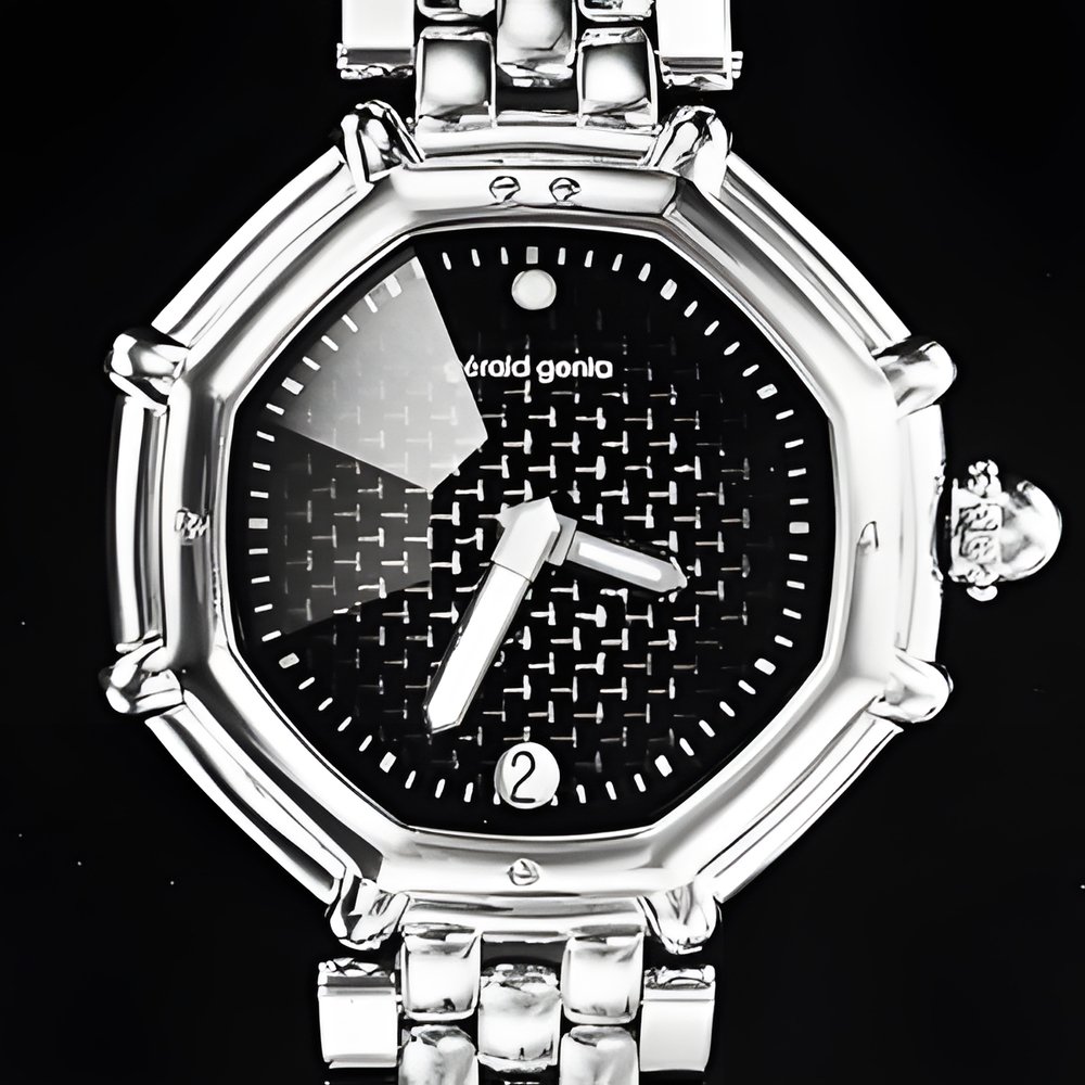 “Success” is the name of Gérald Genta’s new product line. This eightsided sports watch is available in steel, steel and gold and in solid gold. Gérald Genta No. 10 twin-barrel selfwinding movement, 11 1/2 lines, 25 jewels, 28,800 v.p.h. “Carbon fibre” dial. Its luminous cut-sapphire hands and facetted sapphire crystal are both covered by patents. (GERALD GENTA “Success”)