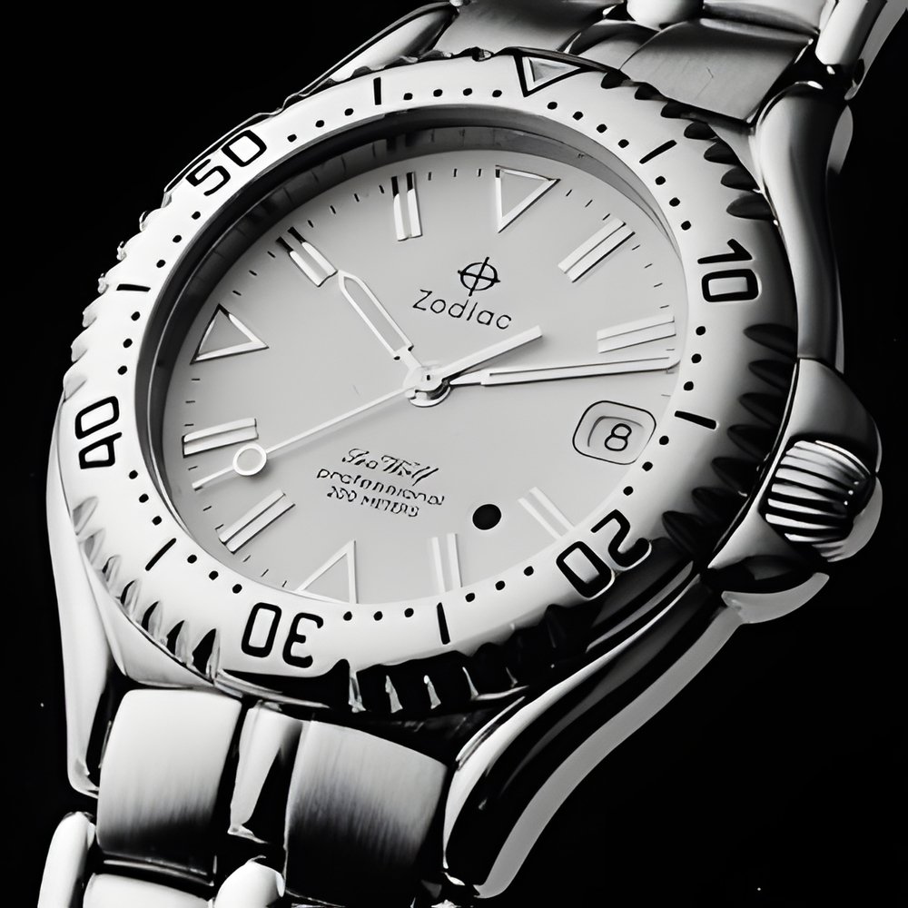 Sporty and stylish, this Zodiac “Seawolf” design, water-resistant down to 200 m, comes with a choice of quartz or mechanical selfwinding movement. 316L-steel case or with two-tone or goldplate finish. Screwed back and screw-locked crown, one-way turning bezel, tritium-enhanced bezel, dial and hands. Exclusive bracelet design, special clasp with extension piece. Available in four sizes. (ZODIAC “Seawolf”)