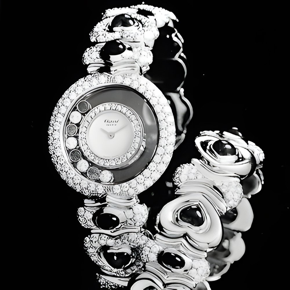 Chopard Genève’s latest entry is a delightfully feminine design in the “Happy Diamonds” collection. In yellow gold, it features a diamond-set bezel; the bracelet is enhanced with more diamonds, heart-shaped rubies and emerald cabochons. 7.73 cts of diamonds in all, plus 4.31 cts of rubies and 1.10 cts of emeralds. Mini-quartz movement. Matching bracelet. (CHOPARD GENEVE)